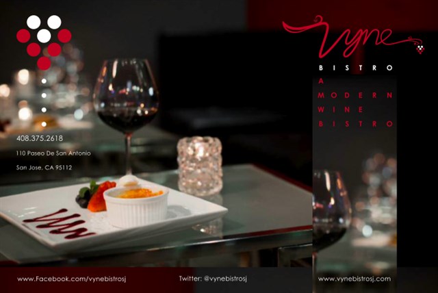 Vyne Bistro is a modern wine bistro serving visitors and residents of downtown San Jose. Cozy up to the fireplace in our lounge, or sit by our floor-to-ceiling windows and watch the world go by. Either way, our modular seating will accommodate your party. The food and wine menu has been developed by experts to be diverse and well-balanced, with an emphasis on freshness and quality. Come in for lunch, or stay through dinner; at whichever hour, perfect food and wine pairing can be found at Vyne Bistro. Come visit us, and stay for a while. Great food, great wine, great friends!